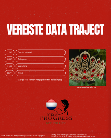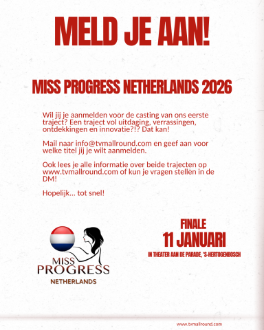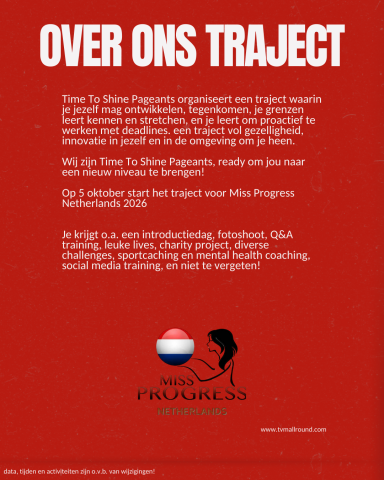 Hier vind je de huidige informatie over het traject van Miss Progress Netherlands 2026, dit zal plaatsvinden samen met het traject van Miss Environment Netherlands 2026.